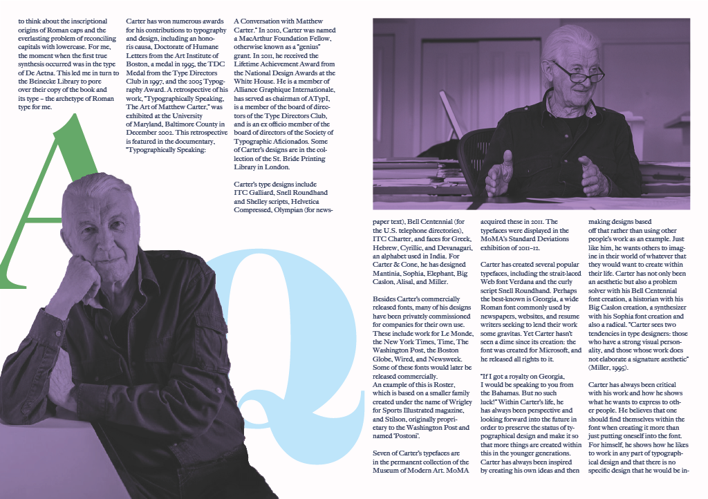 In college, I was given an assignment where I needed to create a magazine article about a designer. For this project, I chose Matthew Carter, creator of iconic fonts such as Big Caslon and Elephant. The main purpose of this assignment was to practice formatting text in interesting ways.