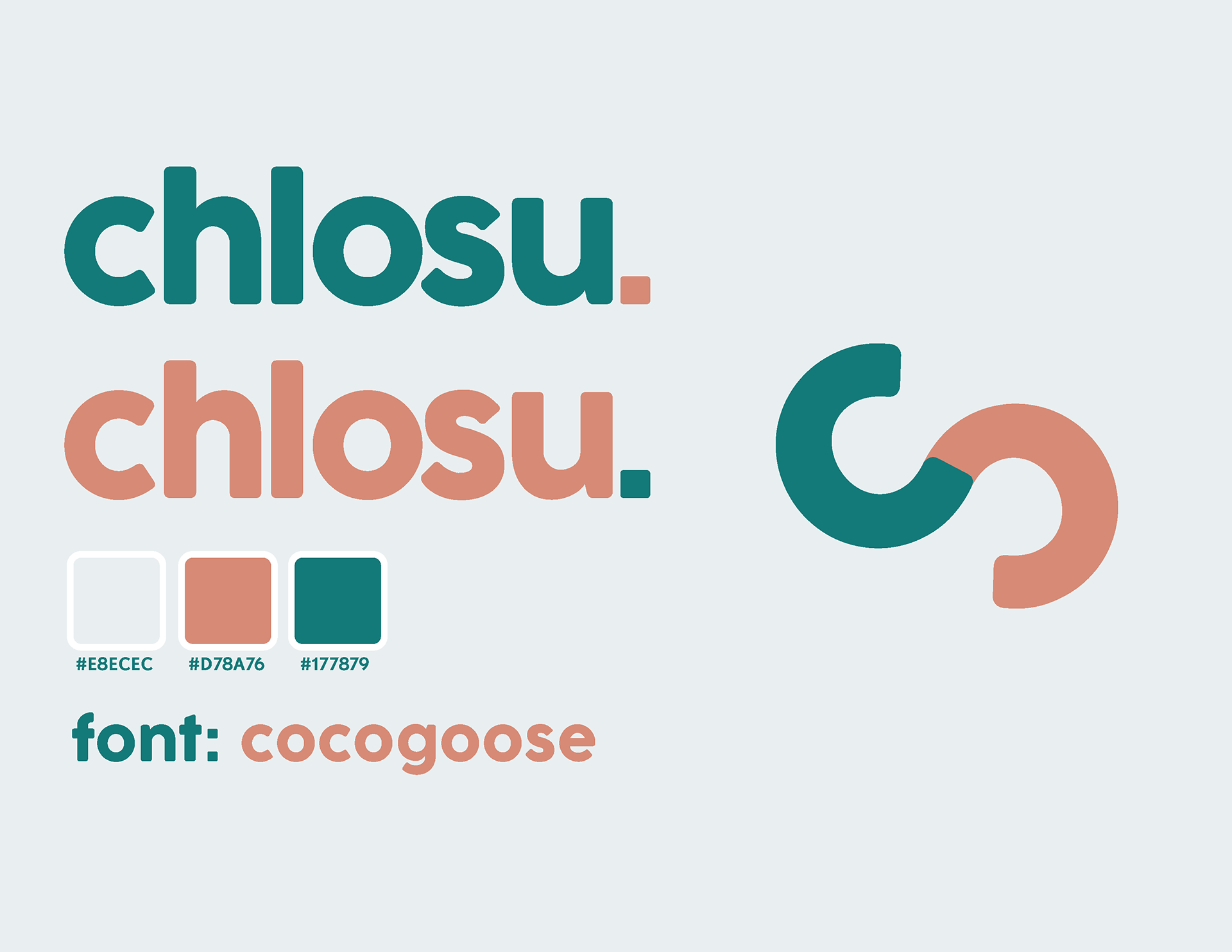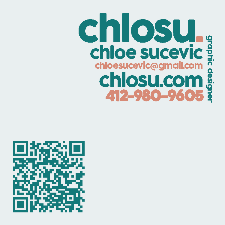 To preface, "chlosu" is the shortened version of my name, Chloe Sucevic. I chose teal as a starter color for my branding because it is one of my favorite colors and I feel that it represents me best. Alongside the teal, I chose a deep coral as the complimentary color. I was told by a professor to never use pure white unless it serves a purpose, so I chose an eggshell white as the third and final color for my branding. My personality is very playful, so I wanted to avoid harsh corners and lines when choosing shapes and fonts for this project, opting for rounded corners and curves when applicable.